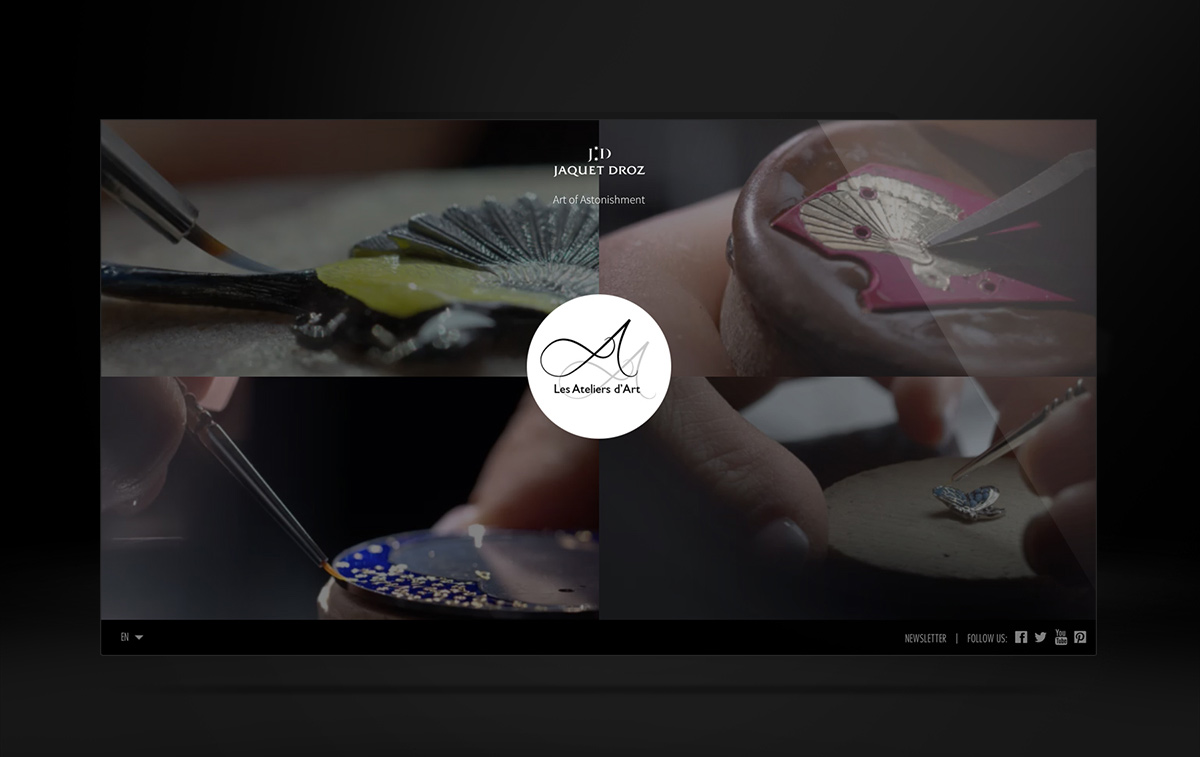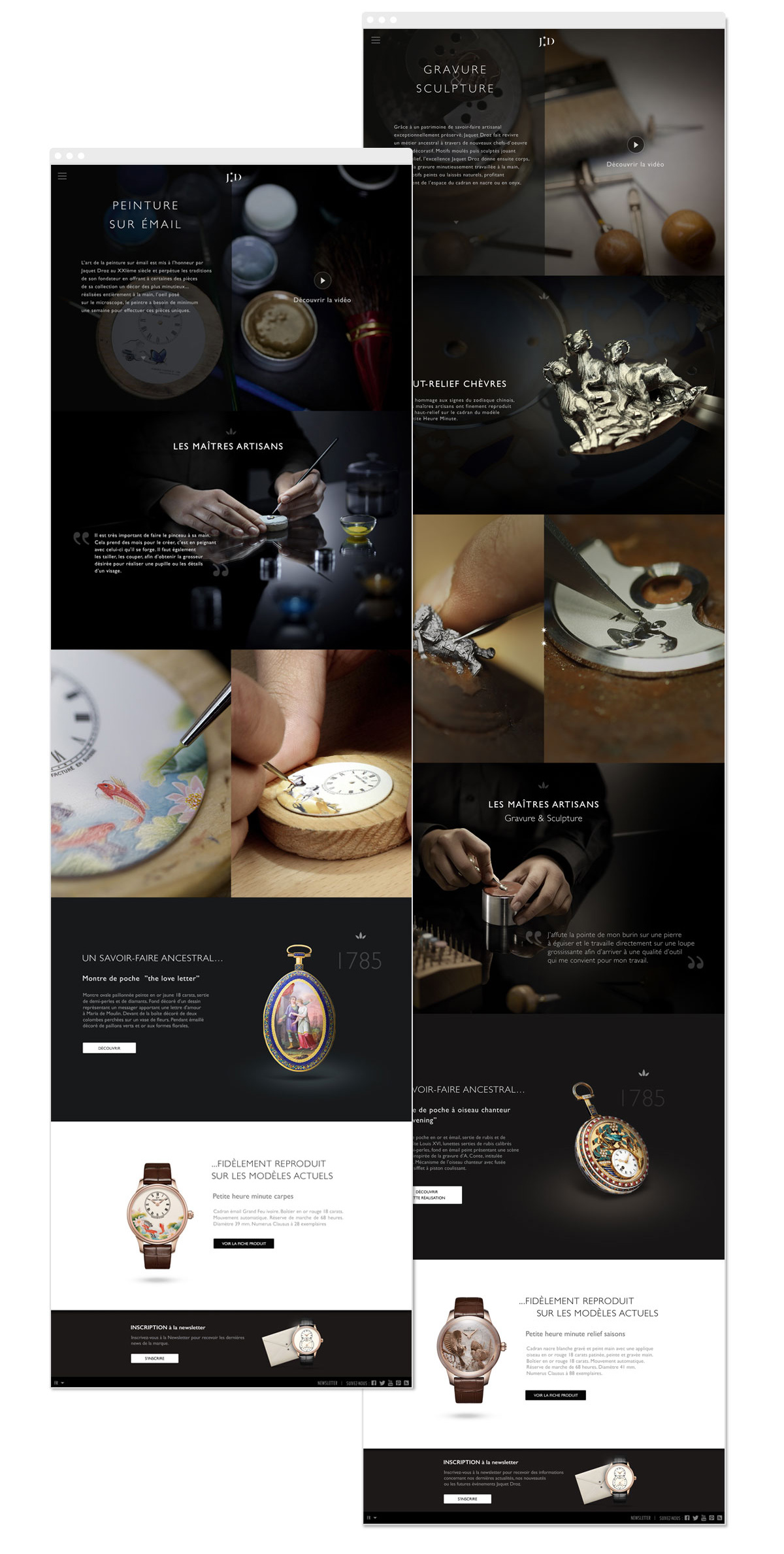 Conception et design du mini-site explorant les ateliers Jaquet Droz. Un parcours au sein des différents métiers d'art chers à la marque, à travers des vidéos, des produits ou des citations des artistes.