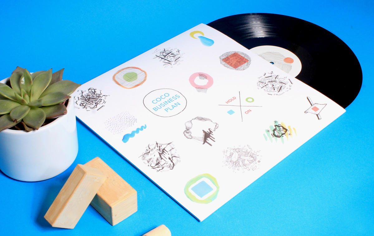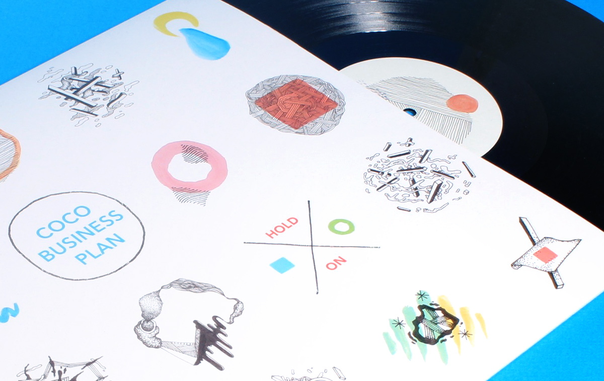 Identité visuelle du duo musical Coco Business Plan. Illustrations et design des vynils, affiches, tee-shirts et livre 24 pages.