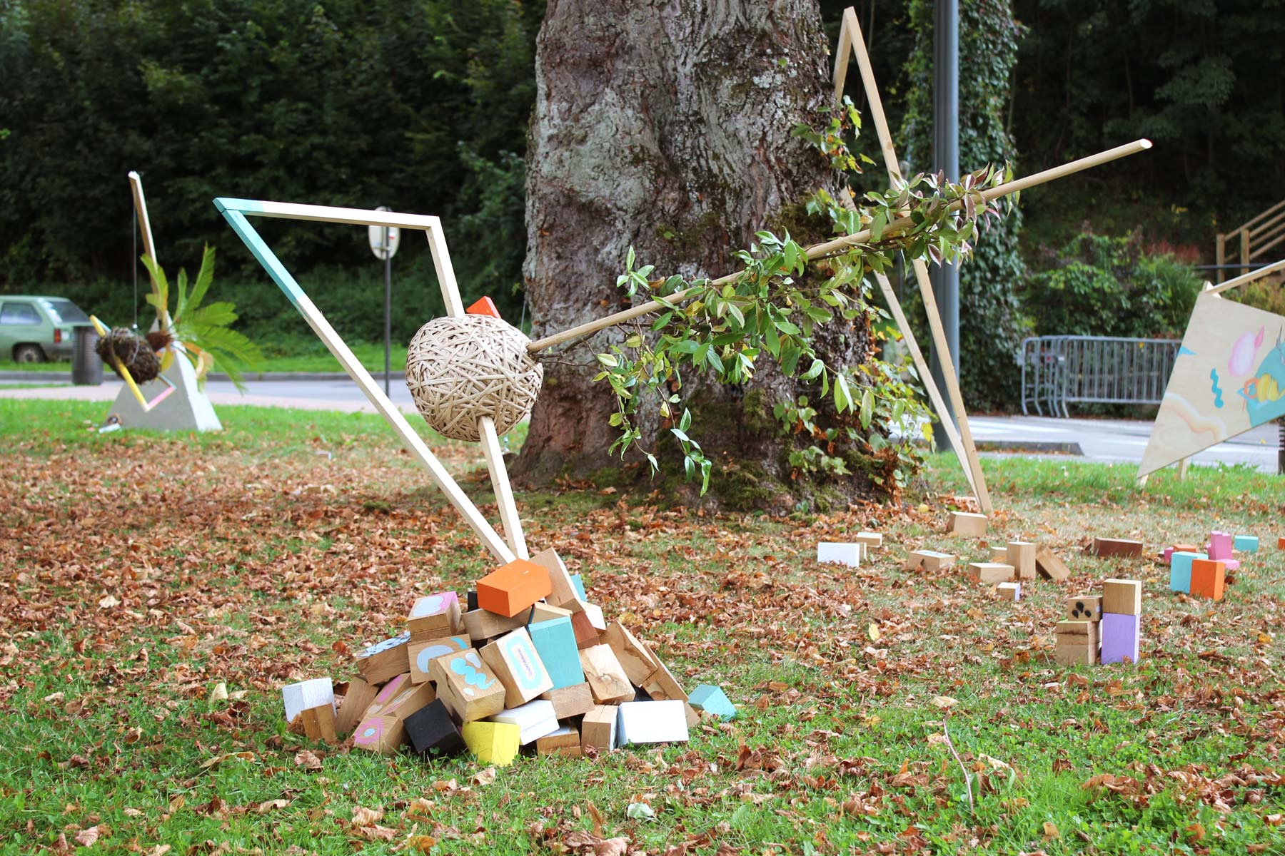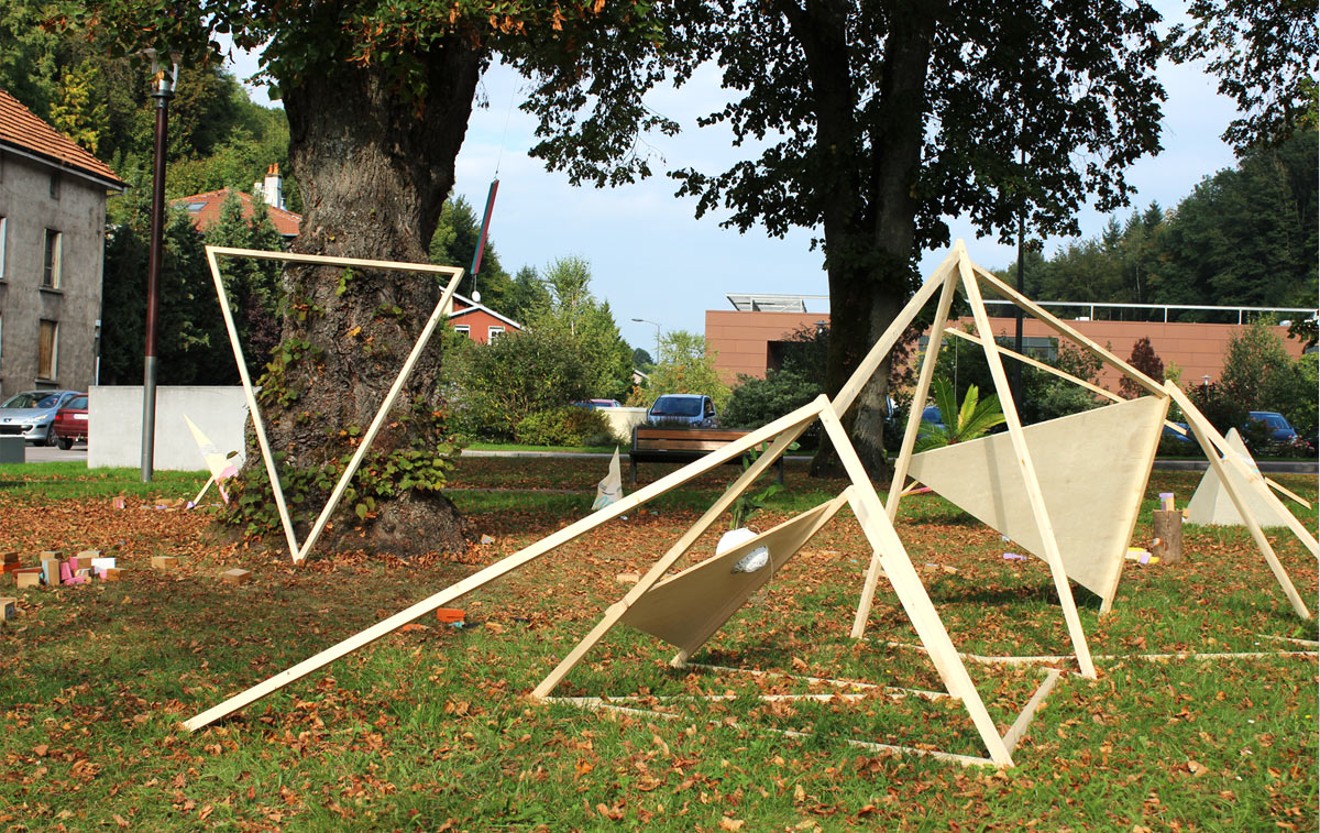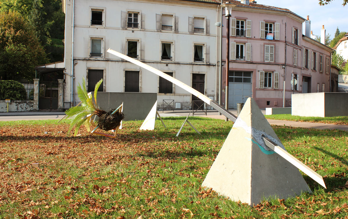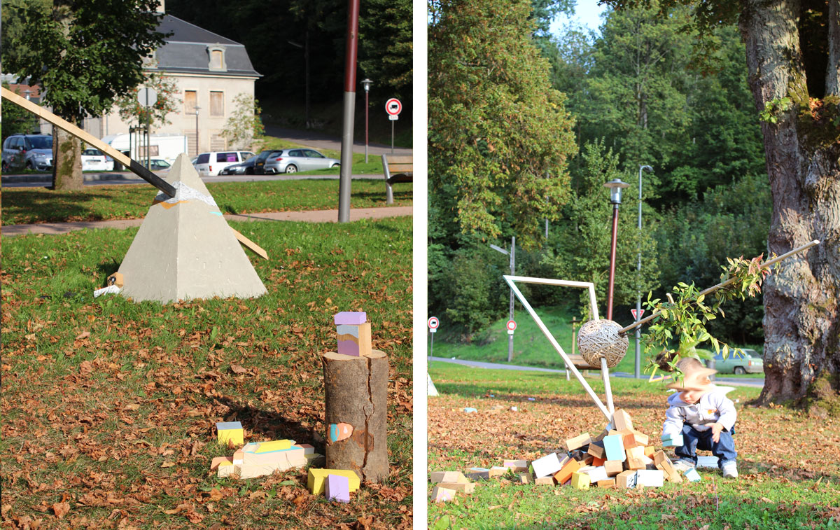 Jardin ludique et surréaliste, fruit d’un travail en groupe de 4 jours et présenté lors de la 5ème biennale d’art contemporain d’Épinal. Un équilibre esthétique entre les composantes naturelles du lieu et les élements crées pour l'occasion.