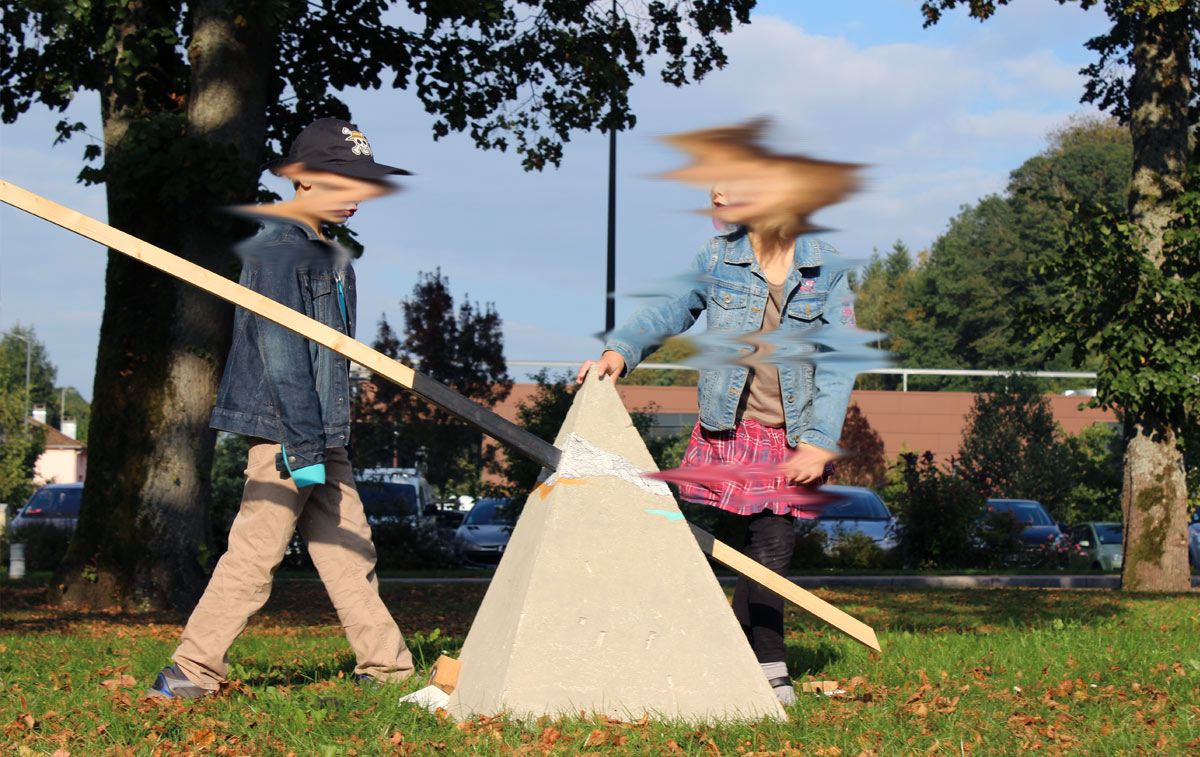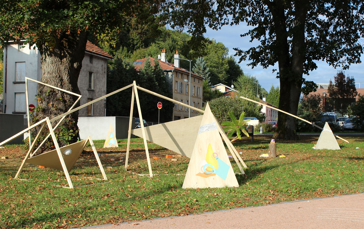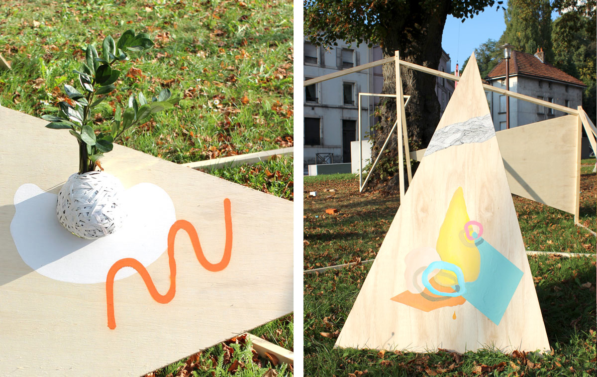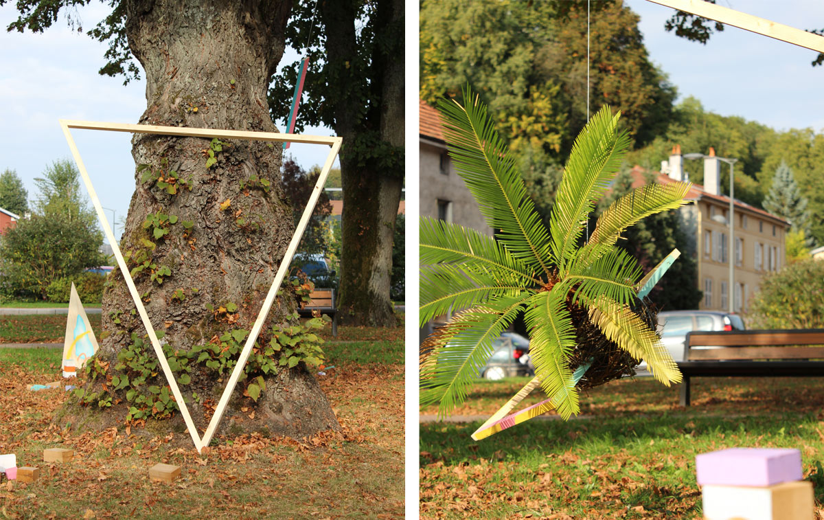 Jardin ludique et surréaliste, fruit d’un travail en groupe de 4 jours et présenté lors de la 5ème biennale d’art contemporain d’Épinal. Un équilibre esthétique entre les composantes naturelles du lieu et les élements crées pour l'occasion.